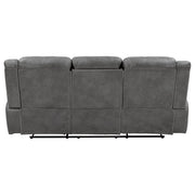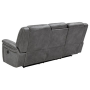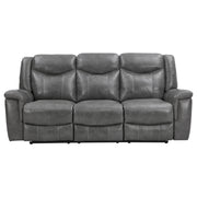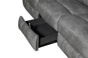Bring luxury and convenience to your living room with this reclining sofa upholstered in smooth grey faux leather. Designed with plush padded seating, headrests, and armrests, it ensures exceptional comfort. The drop-down centre table reveals dual cup holders, a pop-up power outlet with two AC and two USB ports, and a hidden storage drawer for added practicality. A wall-hugger mechanism saves space, while a one-inch cool gel memory foam topper enhances softness for an upgraded lounging experience. Key Features: • Manual reclining sofa with smooth wall-hugger space-saving design • Grey faux leather upholstery adds sleek, modern visual appeal • Drop-down centre table includes two cup holders for convenience • Pop-up power outlet with dual AC and USB ports enhances utility • Hidden storage drawer keeps remotes and accessories organised • Cool gel memory foam topper delivers long-lasting comfort