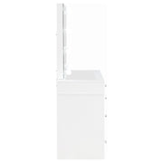 Pull out all the stops to set up a stylish and functional space for your makeup and prep, adding this three-piece white finish vanity set to a modern bedroom. Wood products construction with mirrored drawer fronts and a gray upholstered stool cushion team up to maintain an easy palette with versatility. Find space in nine drawers to stash implements, cosmetics, and accessories. Charming crystal knobs and a felt-lined top drawer add to a list of fab features. The marquee element of this set is a mirror surrounded with bulbs to offer helpful lighting as it enhances a chic design. Key Features: • Three-piece white finish vanity set, perfect for a modern bedroom setup • Constructed from wood products, featuring mirrored drawer fronts for a sleek look • Comes with a gray upholstered stool cushion, providing comfort and style • Offers ample storage with nine drawers, including a felt-lined top drawer, all adorned with charming crystal knobs • Includes a mirror surrounded by bulbs, providing helpful lighting and enhancing the chic design