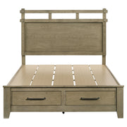 This platform storage bed blends graceful simplicity with practical function. A vineyard oak finish highlights the embossed oak grain across rubberwood and engineered wood veneer. The headboard features framed platforming with open slat detail for added visual lightness. Two footboard drawers provide concealed storage, supported by durable center metal glides. A warm transitional style, this bed balances everyday utility with natural wood textures and quiet charm. Key Features: • Queen platform storage bed finished in vineyard oak with oak grain embossed veneer • Framed headboard with open slat accents adds visual depth and balance • Two footboard drawers provide concealed storage for linens or accessories • Drawers feature center metal glides for smooth and durable use • Crafted from rubberwood and engineered wood veneer for strength • Medium density fiberboard (Mdf) platform panels provide unbeatable support with no foundation needed