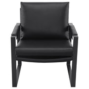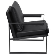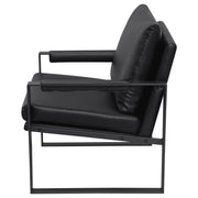 Cool modern style turns the Rosalind accent chair into a tasteful choice for your casual living room or home office. Begin with the lush feel of eco-friendly smooth vegan leather upholstery. This accent chair borrows from a retro motif yet updates any space with a carefree ambiance. Its gunmetal finished metal frame adds an open squared design on side brackets with strips of upholstery covering each armrest. Sit comfortably on a removable seat and lean against a back cushion with generous padding. Key Features: • Lush feel of eco-friendly smooth vegan leather upholstery • Retro motif updates any space with a carefree ambiance • Gunmetal finished metal frame with open squared design • Removable seat and back cushion with generous padding • Strips of upholstery covering each armrest