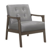 Mid-Century Modern lines define the profile of the Alby Collection accent chair. Contoured arms top the framing of the chair. The button-tufted back and plain seat of the chair are covered in dark brown faux leather upholstery, with walnut finish over solid wood.