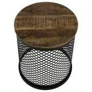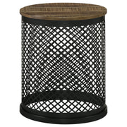 Blending rustic charm with industrial flair, this round accent table makes a striking addition to any space. The solid mango wood top, finished in a deep natural tone, highlights the organic wood grain for a warm, inviting look. The black iron drum base features an intricate perforated latticework design with a quatrefoil pattern, adding a layer of visual depth and texture. Whether used as a side table, nightstand, or decorative accent, this piece offers versatility and style to modern, industrial, or eclectic interiors. Key Features: • Solid eco-friendly mango wood top with a rich natural finish • Intricate metal lattice drum base in a bold black finish • Perforated quatrefoil pattern adds texture and depth • Versatile design functions as a side table or nightstand • Blends rustic, industrial, and modern aesthetics seamlessly • Compact yet statement-making for living rooms, bedrooms, or lounges