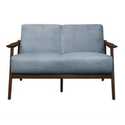 The frame of the Carlson Collection recalls a time when simplicity of profile was the height of style. The streamlined design of the love seat's subtly sloped wood arms and legs is finished in dark walnut which serves to highlight the blue-gray velvet covering.