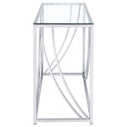 This rectangular console table combines modern elegance with practical design. Featuring a clear tempered glass top, it offers both durability and style. The electroplated chrome frame adds a sleek, polished finish, while gracefully curved metal accents enhance its sophisticated look. Ideal for placement in hallways, entryways, or behind a sofa, this table blends function with form, providing a stylish surface for display or storage in various living spaces. Key Features: • Rectangular console table with a clear tempered glass top • Electroplated polished chrome frame with a sleek reflective finish • Gracefully curved metal accents add modern sophistication • Durable metal construction ensures long-lasting stability and use • Versatile design perfect for hallways, entryways, or behind a sofa • Sleek, minimalist structure complements contemporary interiors