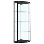 Bring your decor to elegant life with this stunning, modern curio cabinet. A triangular silhouette with cool, clipped corners adds artistic appeal to this glamorous piece. The sleek, metal supports flaunt a gleaming chrome finish. Three tiers of shelving offer elegant display space for photos and decorative keepsakes. Crafted of metal and tempered glass, this beautiful cabinet is built for superior strength and durability. Key Features: • Modern curio cabinet with triangular top and bottom base provides classic elegance • One clear tempered glass door provides simple access to your keepsakes • Three clear tempered glass shelves provide strength to support your display items • Metal supports in chrome finish • Glass, MDF, and laminate construction