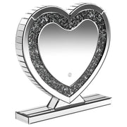 This heart-shaped table mirror blends glam style with practical lighting, perfect for vanities or dressing areas. The mirrored frame features an inset of faceted acrylic crystal inlay that catches light beautifully, while integrated LED illumination adds clarity for grooming or makeup application. Its freestanding design and decorative shape make it as functional as it is eye-catching, ideal for bedroom surfaces or beauty stations. Key Features: • Tabletop vanity mirror with a heart-shaped silhouette for decorative charm and function • Mirrored frame adds sleek shine and elevates the glam-inspired design • Inset acrylic crystal inlay creates a shimmering, textured border • Built-in LED lighting provides enhanced visibility for makeup and grooming • Freestanding base allows stable placement on dressers or vanity tops • Ideal for bedrooms, beauty stations, or glam-themed personal spaces