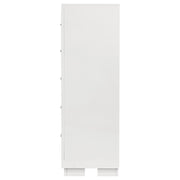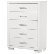 Graceful proportions and contemporary simplicity define this five-drawer chest. Designed for both elegance and function, its spacious drawers glide open to reveal generous storage for garments and essentials. Sleek bar pulls accent the clean lines of its modern silhouette, while a smooth finish enhances the natural warmth of the wood. With refined balance and lasting craftsmanship, this piece elevates the art of everyday organization. Key Features: • Five-drawer chest designed with sleek lines and understated refinement • Snow white finish brightens interiors with a clean, radiant appearance • Felt-lined top drawer cushions jewelry and delicate accessories • Silver-tone bar pulls lend graceful contrast with contemporary flair • Rubberwood and engineered wood frame ensures durability and poise • Tipover restraint included for stability and peace of mind in use