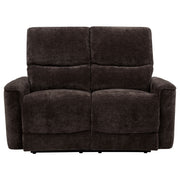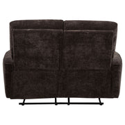 Softly tailored and built for comfort, this reclining loveseat invites everyday relaxation with ease. Deep cushions and plush chenille upholstery wrap you in warmth, while channel tufting along the back enhances support and flow. Smooth manual recliners extend at your fingertips, offering personalized comfort from seat to seat. Framed in durable wood and metal, it brings a perfect balance of softness, structure, and restorative ease to any living room. Key Features: • Reclining loveseat with manual recline and plush cushions for laid-back comfort • Dark brown chenille upholstery offers a cozy texture with soft, inviting warmth • Channel-tufted backrests deliver contouring support and casual structure • Wide padded arms provide comfort and relaxation in any position • Crafted from fabric, metal, plywood, and foam for dependable use • Ideal for casual living rooms seeking softness, ease, and functional style