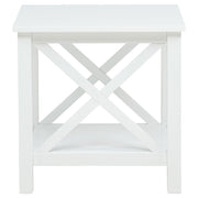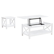 Blending clean lines with classic charm, this occasional table set offers timeless appeal with practical purpose. The lift-top coffee table features hidden storage and a rising surface for flexible use, while the matching end table provides open shelving and farmhouse-inspired X-frame sides. Finished in bright white and crafted from pine and engineered wood, this living room set brings fresh energy and functional design to everyday moments. Key Features: • Occasional table set with lift-top coffee table and matching X-frame side table • White finish provides a clean, versatile look for farmhouse or coastal themes • Lift-top coffee table reveals hidden storage for remotes, books, or blankets • End table includes an open shelf and square top for added display space • Crafted from solid pine and engineered wood for everyday durability • Perfect for casual living spaces seeking charm, utility, and coordinated design