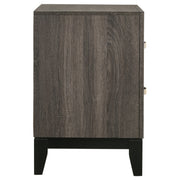 A contemporary take on mid-century modern design, the color blocking from this grey two-drawer nightstand sets it apart from the rest. Constructed of oak, the body showcases a light, exposed wood grain that oozes sophistication. Tapered legs in a black finish offer a modern feel, adding visual intrigue with neutral hues. Bright and metallic, light drawer pulls curve off the flat drawer fronts in a half moon shape. Complete a retro motif, or add fun flair to an up-to-date scheme. Key Features: • Transitional style bedroom at a great value • Nickel finished hardware highlights two-tone grey oak finish • Black grooves create a dimensional look • Three-dimensional engineered foil paper veneer in grey oak and black • English dovetail drawer construction • Black finish legs are crafted of solid hardwood