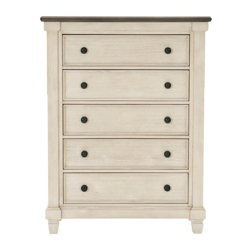 Weaver Collection by Homelegance Furniture Two Tone finish Antique white and Rosy brown color Made of acacia veneer and wood 5 dovetailed drawe...