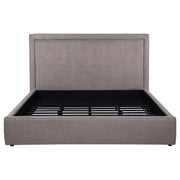 Clean lines and understated elegance define this platform bed, wrapped in smooth upholstery from base to headboard. The simple panel design offers a tailored profile, softened by subtle padding and low foot rails for an inviting finish. With a fully slatted foundation, this bed supports a mattress directly, no box spring needed. Perfect for modern minimalists or transitional spaces, it balances comfort and clarity in a sleek, grounded silhouette. Key Features: • Queen bed with clean panel headboard and fully upholstered low-profile frame • Light saddle fabric adds warm tone and soft texture with a neutral foundation • Padded headboard delivers comfort and structure in an understated silhouette • Platform base with slats eliminates need for a box spring or foundation • Crafted with engineered wood, and supportive foam fill • Perfect for transitional or modern bedrooms with a minimalist focus