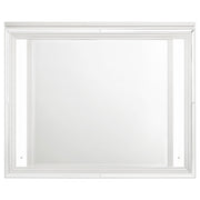 Create a cohesive and luxurious look in your bedroom with this bedroom set. Featuring a bed, nightstand, dresser, mirror, and optional chest, each piece is designed with a modern Italian aesthetic. The white finish, picture framed recessed panels, and embossed herringbone graphic patterns exude sophistication, while the mirror framing, acrylic legs, and polished chrome metal hardware add a touch of opulence. This set offers both style and functionality, making it the perfect choice for your elegant bedroom. Key Features: • Four-piece queen bedroom set with modern Italian design • White finish with picture framed recessed panels and embossed herringbone graphic patterns • Touch LED lights in the headboard and mirror provide added convenience and a modern touch to your bedroom • Nightstand with cord management access and dresser with removable jewelry tray • Mirror framing, acrylic legs, and polished chrome metal hardware