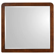 Transform your bedroom into the ultimate retreat with this mid-century modern bedroom set. Expertly crafted from pine, engineered wood, and walnut veneer, the set includes a bed, nightstand, dresser, mirror, and optional chest for a cohesive look. Rounded edges, tapered legs, and square tufting lend a retro-inspired flair, while felt-lined top drawers in case pieces and dual USB ports in nightstand add practical convenience. This collection combines style and functionality for a truly luxurious bedroom experience. Key Features: • Mid-century modern bedroom set with a cohesive aesthetic • Rounded corners throughout add an updated, modern flair • Fabric upholstered bed with thick padding and square tufting • Nightstand includes dual USB ports for device charging • Felt-lined top drawers protect delicate items • Constructed with pine, engineered wood, and walnut veneer