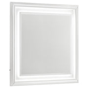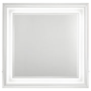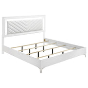 Crisp white high gloss and sculptural textures define this modern bedroom set, blending sleek surfaces with dimensional details. Geometric drawer fronts feature ribbed V-patterns and polished chrome pulls, while all drawers glide smoothly on 45mm metal extension hardware. The headboard stands out with chevron-tufted white faux leather framed by soft white LED trim. Completing the ensemble, a coordinating LED dresser mirror adds ambient glow and polished symmetry to the space. Elevated on chrome legs, this set is a showcase of contemporary form and function. Key Features: • White high gloss bedroom set with sculpted drawer fronts and chevron-tufted LED headboard • LED dresser mirror adds ambient lighting and visual symmetry to the modern design • All drawers include 45mm metal extension glides for smooth and reliable performance • Top drawers are fully lined in black felt to protect valuables and add elevated utility • Chrome U-shaped pulls and tapered acrylic legs provide sleek contrast and support • Crafted from engineered wood and faux leather for durability and shine
