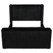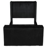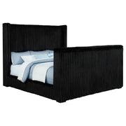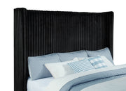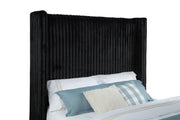 Unveil a new chapter of indulgence with this velvet wingback bed, where high style meets high tech. Richly upholstered in decadent black velvet, its vertical channeled frame embraces you in plush softness. Hidden within the footboard, a concealed TV lift fits up to 50-inch TVs and rises with the push of a button. A built-in power outlet with three AC ports adds plug-and-play convenience. This bed transforms any room into a sanctuary of luxury, beauty, and cinematic escape. Key Features: • Queen bed with tall wingback frame and vertical channel tufting in black velvet • Built-in TV lift mechanism accommodates TVs up to fifty inches in size • Three-outlet AC power strip hidden in footboard for seamless device connection • Plush velvet upholstery adds glam texture to the sculptural modern silhouette • Foam-padded and fully upholstered for comfort and a clean, finished look • Crafted from birch, engineered wood, and plywood for durability and support