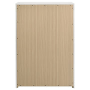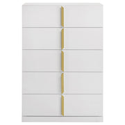 Inspired by Italian contemporary design, this five-drawer chest of drawers blends sculptural elegance with lasting performance. The white high gloss finish is laminated in PET, a high-performance thermoplastic known for its scratch resistance, moisture resistance, and long-term durability. Vertically mounted polished gold pulls add a bold accent, while five spacious drawers provide stylish storage for the modern bedroom. Key Features: • Five-drawer chest of drawers with bold vertical symmetry and Italian-inspired styling • Eco-friendly PET thermoplastic veneer is scratch-resistant and easy to maintain • PET surface resists moisture, heat, and UV exposure without yellowing or warping • Polished gold pulls are vertically mounted for sculptural elegance and contrast • Drawers feature English dovetail joinery and smooth operating metal glides • Fully assembled and includes tip-over restraint for added safety