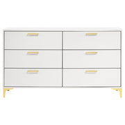 Maintain a cheerful and luxe bedroom with this splendid modern glam dresser. A perfect statement piece for contemporary bedrooms, this six-drawer dresser presents a light and airy expression. Accented with gold finished drawer pulls and bracket style legs, a luxe vibe shines through. The crisp, white finish maintains a sleek, dignified presence as well. Long and narrow, this dresser makes a lovely addition to your bedroom's focal wall and grounds a vanity dressing area. Key Features: • Perfect for contemporary and modern bedrooms • Six deep drawers offer all the space you need for garments and accessories • The bright, white finished frame ensures a light and airy disposition • Gold finished pull handles create a luxe flair • Gold bracket style legs carry through the warm metallic accents