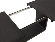 Rooted in quiet strength and sculptural beauty, this extension dining table brings graceful presence to every gathering. Its soft-edged rectangular top rests on a bold pedestal base, finished in burnished black for depth and contrast. When needed, a removable leaf extends the surface with the help of equalizing metal cable glides, allowing for smooth expansion. Whether hosting intimate dinners or festive occasions, this table adapts with effortless elegance. Key Features: • Rectangular extension table finished in burnished black with softened corners • Removable leaf extends the tabletop to nearly ninety-six inches with ease • Equalizing metal cable glides ensure smooth, balanced one-person operation • Architectural pedestal base provides sculptural support and open grounding • Elegant scale supports both everyday meals and larger dinner occasions • Constructed from ash veneer, rubberwood, and engineered wood
