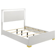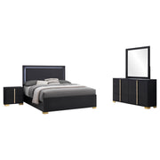 Gleaming gold accents create a sense of richness and elegance for a contemporary bedroom set. In a black finish that's crisp and timeless, the set offers a stylish, modern bed complete with a squared headboard and low footboard, offering an airy feel in your bedroom. The headboard is equipped with built-in LED lighting operated by touch switches on the left and right sides, within easy reach from either side of the bed. The mood lighting creates a lovely ambiance while accent pieces in the set offer plenty of storage. The dresser is topped with a framed mirror, great for opening your space and providing a great spot for choosing jewelry or a tie in the morning. Key Features: • Sleek black finish with gold accents for a contemporary look • 4-piece queen bedroom set includes bed with LED headboard, nightstand, dresser, and mirror • LED headboard with touch switches for easy operation • Dresser topped with framed mirror for added storage and style • Mood lighting creates a lovely ambiance in the bedroom