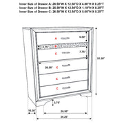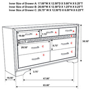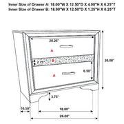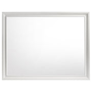 Encourage a glam vibe in your refined bedroom with a modern four-piece bedroom set. Centering on a stylish bed with an upholstered headboard and low footboard, the set includes a two-drawer nightstand for easy bedside storage and display space. A seven drawer dresser and mirror complete the set, adding diamond-like trim across its face that catches the light and offers a sophisticated touch. Bracket feet add a touch of dimensionality and movement to each piece and jewel-like bar pulls add intriguing sparkle. A cool white finish is textured, while white finish trim is smooth, creating a touch of textural contrast that add engaging style. Key Features: • Bedroom set with upholstered panel bed featuring glitter-accented headboard stripe • Textured white panel surfaces contrasted by smooth white molded trim throughout • Low profile footboard and bracket legs offer a modern and airy foundation • Storage cases include secret jewelry drawers behind glittery front panels • Drawers are felt-lined and glide on full-extension hardware for smooth operation • Crystal-style handles and sparkling trim provide glam-inspired sophistication