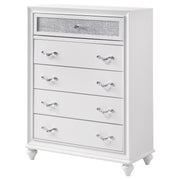 Bring sparkling sophistication to your bedroom with this five-drawer chest. The top drawer is accented with glittery acrylic panels that shimmer against the crisp white finish, while faceted crystal hardware adds a glamorous finishing touch. Sculpted bun feet introduce a classic detail that balances the modern design. Built with a sturdy frame of solid rubberwood and engineered wood with okume veneer, this chest offers durability along with generous storage space for everyday essentials._x000D_ Key Features: • White chest with five drawers and sparkling decorative panel accents • Top drawer includes glittery acrylic paneling for shimmering dimension • Faceted crystal hardware adds a glamorous sparkle to each drawer front • Generous storage capacity keeps clothing and essentials neatly organized • Frame is built with solid rubberwood, engineered wood, and okume veneer • Classic bun feet complete the design with elegant and timeless character