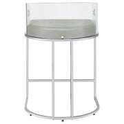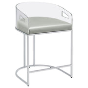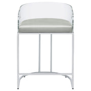 Ultra-modern with a retro-inspired vibe, this pair of stools make a striking piece to a dining room space. With a curved backrest in a clear acrylic material, each stool offers an open and airy design. Rest comfortably on a leatherette cushion as you dine or sip a cocktail. In addition, each stool is supported by a slim metal legs in a lustrous chrome finish and a base shape that mimics the rounded acrylic backrest. Pull up a pair of these stools to a kitchen bar or complete a compact home bar. Key Features: • Ultra-modern with a retro-inspired vibe, these stools feature a curved backrest in a clear acrylic material, leatherette cushion, and slim metal legs in a lustrous chrome finish • Base shape mimics the rounded acrylic backrest for a cohesive look • Open and airy design offers a comfortable seating experience • Ideal for a kitchen bar or compact home bar • Striking piece to a dining room space