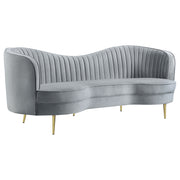With an Art Deco flair, this retro-inspired sofa offers a striking curvy silhouette with a bold colored fabric. Wrapped entirely in a bright blue velvet that is super-soft to the touch, this contemporary sofa presents itself as the focal piece in your seating area. With a channel tufted interior cushions and kidney-shaped bench cushion, this tuxedo-inspired sofa offers a twist on a timeless iconic style. An inverted camelback silhouette with gleaming gold tapered legs lend a mid-century flair. Complete your seating ensemble with an available matching loveseat and barrel-shape chair. Key Features: • Sculptural modern glam in a beautiful shade of blue velvet • Sofa features an inverted camel back creating the right touch of curve appeal • Tailored, vertical channels frame inside back providing a stylish back drop to the kidney shaped attached bench seat • Gold stainless steel tapered legs add the finishing touch