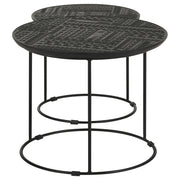 Add a modern rustic touch to your space with this two-piece nesting table set, designed for style and function. Crafted from eco-friendly solid mango wood, the embossed tribal-inspired ink blot pattern on the round tabletops adds a textured global aesthetic. Supported by slim black iron bases with a cage-like silhouette, these tables offer an airy and lightweight feel. Ideal for small spaces, the smaller table conveniently nests under the larger one, making it perfect for versatile living areas. Whether used together or separately, this contemporary set blends organic charm with industrial edge. Key Features: • Two-piece nesting table set crafted from solid eco-friendly mango wood • Embossed tribal-inspired ink blot pattern adds global flair • Slim black iron base with an airy, cage-like silhouette • Space-saving design allows the smaller table to slide under the larger one • Versatile functionality perfect for living rooms, bedrooms, or cozy corners • Blends rustic, industrial, and contemporary aesthetics seamlessly
