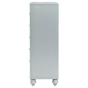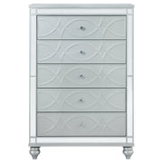 Enhance your home with a modern glam update to a classic design with this transitional five-drawer chest. It boasts a dazzling design that takes lends glitz to any modern bedroom. It comes in a vibrant silver metallic finish with fret work detail on the front panels and drawer fronts. The drawers are adorned with crystal-like pulls and the top ones are lined with black felt to protect treasured valuables. Delicate bun feet complete the design of this exquisite masterpiece. Key Features: • Five-drawer chest with vertical layout and glamorous silver finish • Mirrored trim frames each side and highlights the fretwork drawer fronts • Crystal-like drawer knobs add sparkle and coordinate with matching pieces • Top drawer includes felt lining for storing small valuables or accessories • Classic bun feet anchor the design with a soft traditional touch • Built from engineered wood, polyresin detailing, and mirrored veneer