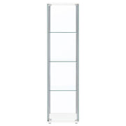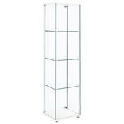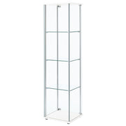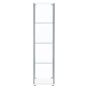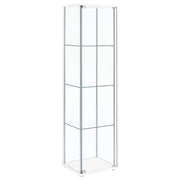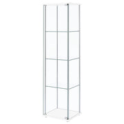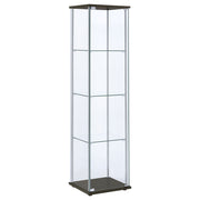 This curio cabinet blends modern simplicity with timeless display function, offering a tall, streamlined silhouette. Clear tempered glass panels and three sturdy shelves create an airy showcase for treasured keepsakes. Chrome tone supports frame the design with contemporary flair, while a rectangular top and base add subtle stability. Crafted with glass, engineered wood, and laminate veneer, this cabinet serves as both storage and statement in living or dining spaces. Key Features: • Curio cabinet with cappuccino base and top, four shelf design, chrome supports, clear glass • Cappuccino finish curio cabinet, rectangular top and base, chrome supports, tempered glass • Four shelf curio cabinet in cappuccino, clear tempered glass shelving, chrome metal accents • Cappuccino finished base with chrome support beams, three tempered glass shelves, tall frame • Modern cappuccino curio cabinet with chrome details, engineered wood base, tempered glass door • Cappuccino tone cabinet with chrome structure, laminate veneer base, three glass shelves inside