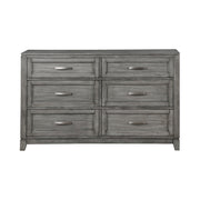 The Garretson Collection blends transitional lines with rustic styling to create an elegant addition for your bedroom. The distinct grain of the okume veneer features a gray finish. Metal bar hardware accents the picture frame drawer fronts of the dresser.