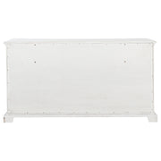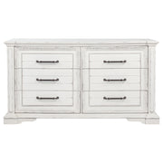 Classic and composed, this six-drawer dresser blends traditional design with elegant practicality. Its vintage white finish is gently distressed, accentuating ornate trim and antique bronze drawer pulls. A hidden jewelry tray tucked into the bottom drawer adds a thoughtful touch, while spacious drawers offer smooth functionality. Crafted from poplar and engineered wood, it brings heritage-inspired charm to any bedroom. Key Features: • Six-drawer dresser with traditional molding and carved details for timeless elegance • Vintage white finish adds aged softness with a warm, antique-inspired look • Antique bronze pulls bring contrast and decorative depth to the frame • Hidden jewelry tray in bottom drawer offers concealed accessory storage • Felt-lined top drawers and durable glides ensure quiet and smooth access • Crafted from poplar and engineered wood for strength and vintage appeal