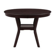 Wood rails top the brown faux leather covered chairs in the Shankmen Collection. Seating four comfortably, the round tabletop is supported by the gently curved legs of the display table base. The collection is offered in an espresso finish.