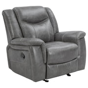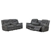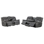 Experience the perfect blend of comfort and functionality with this reclining sofa set, upholstered in smooth grey faux leather for a contemporary appeal. Designed for relaxation, each piece features plush cushioning, padded headrests, and supportive armrests. The collection includes thoughtful upgrades like drop-down tables with cup holders, power outlets, hidden storage, and cool gel memory foam seating. Built with durable metal and plywood framing, this set redefines everyday comfort in modern living spaces._x005F_x000D_ Key Features: • Two-piece reclining sofa set crafted for modern living comfort • Smooth grey faux leather upholstery delivers sleek visual appeal • Sofa includes drop-down table with power outlets and storage • Loveseat console adds dual cup holders and hidden compartments • Cool gel memory foam topper provides lasting seat cushioning • Durable metal and plywood framing ensures long-term stability