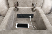 This glider loveseat pairs cozy support with clever convenience. Manual reclining seats invite you to unwind as a smooth gliding mechanism soothes between scenes. A center console adds lift-top storage, a pop-up power hub with USB charging, and stainless steel cup holders to keep essentials close. Supportive pocket-coil cushions and memory foam cradle every position. Trim leatherette with contrast stitching covers a durable frame of foam, engineered wood, and heavy gauge metal. Key Features: • Glider loveseat in taupe faux leather with contrast stitching and padded arms • Manual reclining seats deliver easy comfort for shared relaxation time • Smooth gliding motion adds soothing movement between shows or chats • Lift-top console provides storage, pop-up power with two AC and two USB • Two stainless steel cup holders keep refreshments close at hand • Pocket-coil cushions with memory foam ensure supportive, lasting comfort