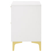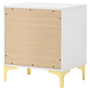 Flank your bedside with this modern glam nightstand. Designed with an elegantly understated, boxy frame, this two-drawer nightstand lends a chic, contemporary aesthetic. Clean lines and a bright, white finish elevate its sophisticated nature. Fastened to each deep drawer is a slim gold pull handle for a touch of metal. Unifying the warm metallic elements are gold bracket style legs that lend a retro look and feel. Key Features: • Perfect for contemporary and modern bedrooms • Two deep drawers offer all the space you need for bedside essentials • The bright, white finished frame ensures a light and airy disposition • Gold finished pull handles create a luxe flair • Gold bracket style legs carry through the warm metallic accents