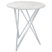 Dress up casual dining areas and entertainment rooms with this sleek modern bar table. Designed with a clean and crisp, round, faux white marble top, this bar height table brings a chic, contemporary meets classic flair to spaces. The striking origami-like sculptural base transform a room, offering an open, airy effect. Made of metal, the tall sharply angled base welcomes you to use it for an open concept floor plan at parties or to host intimate wine tasting nights with friends. Pull up a coordinating bar stool of your choosing to seat up to three comfortably. Key Features: • The round table top is perfect for floating in an open concept floor plan • A faux white marble table top brings a classic touch • Origami-inspired metal base presents a bold look • The shimmering chrome finish offers a modern glam vibe • Perfect for standing around or pulling up your own bar stools
