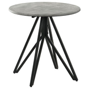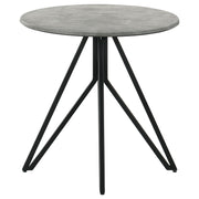 Industrial elements and sleek modern lines bring forth this modern end table. A metal butterfly-like base design of open and flared hairpin style legs in a gunmetal finish offer a striking visual interest to the furniture piece and the room in which is rests. Placed on top of the chic base is a round tabletop that portrays a molded cement for a rustic modern farmhouse flair. The cement-inspired top also offers a textured sandy feel to resemble the true material. Place this modern side table beside an accent chair or allow it to showcase a sculpture or art piece in a loft studio. Key Features: • Round coffee table with a durable cement-like top for industrial style • High-pressure laminate top resists stains, UV light, scratches, and cigarette burns • Gunmetal-finished geometric metal base offers stability and modern appeal • Break-proof and shock-resistant surface ensures lasting reliability • Spacious round top accommodates decor, books, and refreshments • Hairpin-style legs provide an industrial and sculptural aesthetic