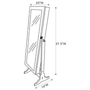 Combine beauty with function to create the perfect bedroom addition. This cheval jewelry mirror is truly an inspired choice, offering a beautiful silver finish to enliven any decor. The rectangular mirror features a lovely border sure to draw attention. Resting in a stand, the mirror tilts to create the perfect angle. Plentiful jewelry storage within makes dressing in the morning or evening a snap. Key Features: • Cheval mirror with integrated jewelry armoire and full-length tilting design • Jewelry armoire interior includes hooks, ring holders, and open storage shelves • Crystal-trimmed mirrored frame enhances the armoire with decorative appeal • Tilting cheval structure offers adjustable full-body viewing angles • Freestanding design provides a space-saving, all-in-one storage solution • Constructed from engineered wood and mirror for lasting durability and style